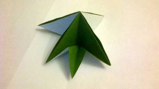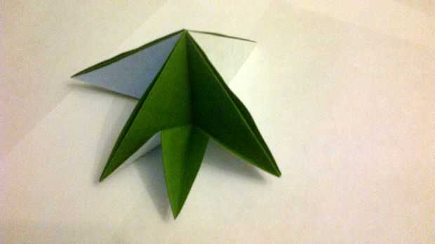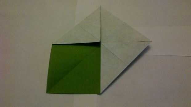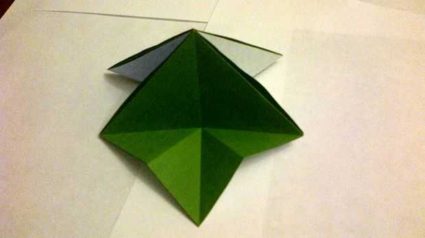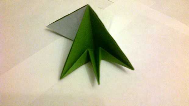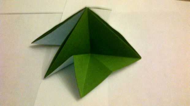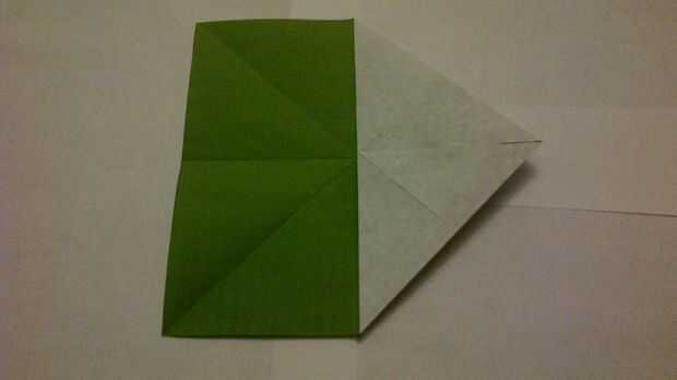 Luego tome los dos bordes verticales y empuje hacia adentro ellos hacia unos de otros para crear un waterbomb base, se explica bien - aquídespués de que tire hacia abajo de una de las aletas blancas y doble la esquina de él sobre el punto correcto de la base del waterbomb y el otro punto.