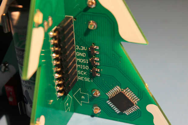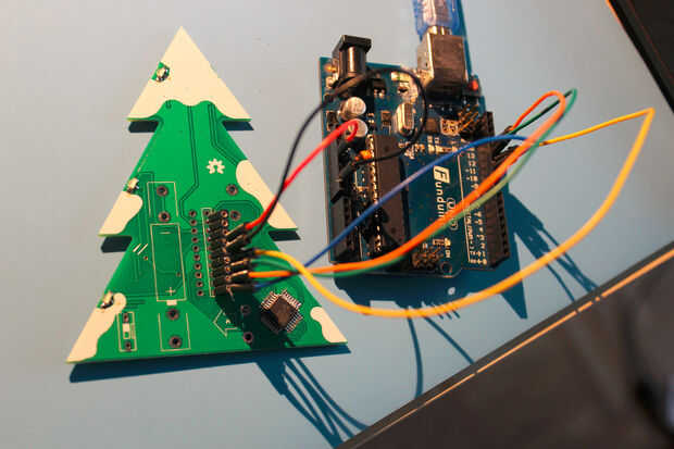 Antes usted puede proceder con la programación, sin embargo, el Arduino se necesita tener el Arduino como ISP programa subido a él, porque esto se utilizará para enviar el programa al árbol de Navidad. Después de hacer esto, conecte los 3.3 V y GND de Arduino a 3.3 V y GND del árbol. Luego, conectar Arduino 10 RESET, pin 11 a MOSI, pin 12 a MISO y la clavija 13 a SCK. Si tienes un Arduino Uno, también conectar un condensador de 10 μF entre RESET y pines GND del Arduino, por lo que costumbre en realidad reajustando.