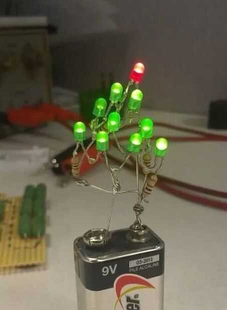 Este escaparate interior de árbol de Navidad animado utiliza una combinación de cinco WS2812 direccionable pixel LED pega la estrella. 16 LEDs de píxel individual ensartados por las luces del árbol de Navidad y una tira de LED verde cortado en tiras