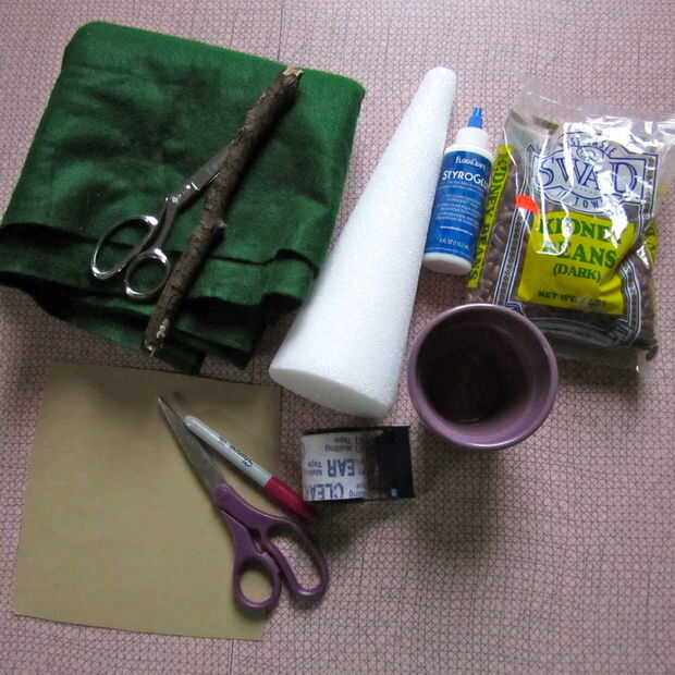 Creo que pines son fáciles de usar con la espuma - sin esperas de secado, y se podría reutilizar el cono con tela otra más adelante. Fieltro es la mejor tela para porque tiene más cuerpo y es más pesado, pero es bueno experimentar. Podría encontrar algo que funcione mejor para usted. También consideré usar encaje ancho verde!