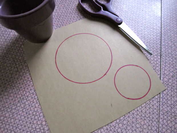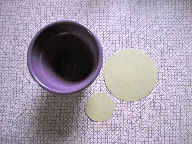 Remontar la tapa y el fondo de la olla. Corte dentro de las líneas trazadas, sobre todo uno para el fondo de la olla para que interior hacia abajo. Usted está esperando para cubrir el agujero de drenaje por lo que ningún grano caiga.