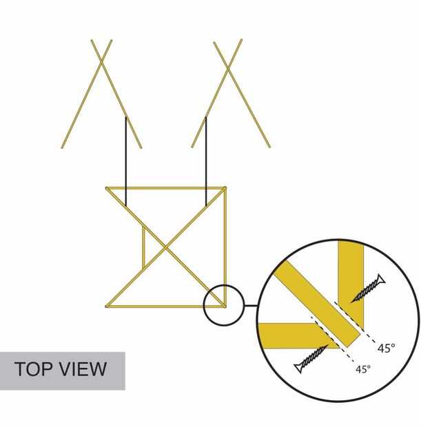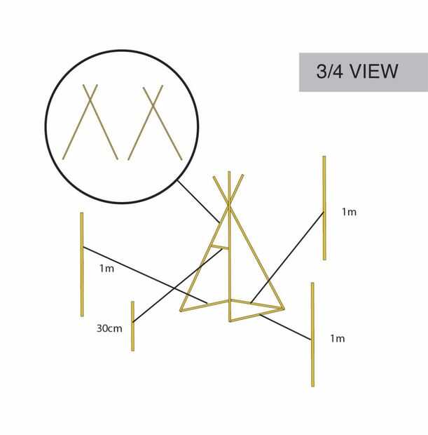 2) Coloque el cruce del primer par de patas sobre el cruce de la segunda. Utilice las piezas de m 1 para crear la parte inferior como se muestra en la vista 3/4 y la vista superior. Deja un lado abierto, se trata de la parte delantera y por lo tanto la entrada de su árbol de Navidad de Tipi.