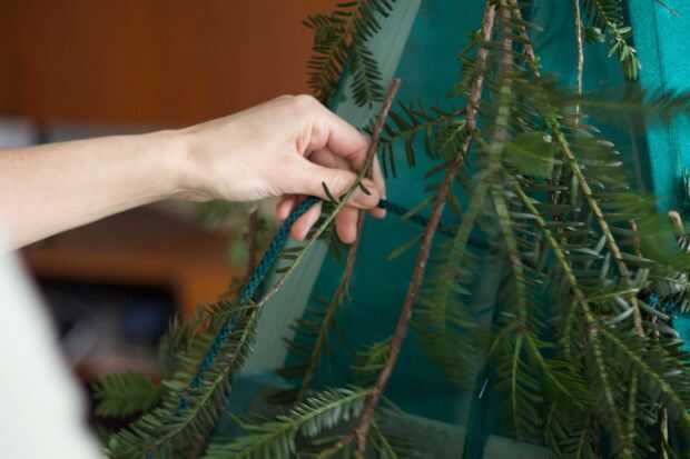 Importante: iniciar en la parte inferior de tu tipi una obra su camino. Como Tejas, las ramas superiores cubrirán los inferiores creando un árbol más como impresión.