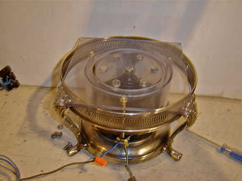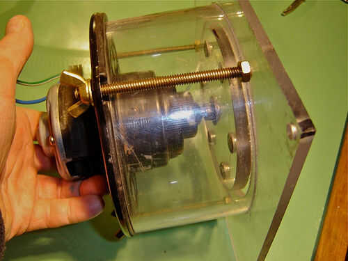 Montaje del motor es simplemente un pedazo largo de 7,5 cm de tubo de policarbonato de 6 pulgadas, pegado a un pedazo de policarbonato cuadrado de 8 pulgadas. El motor es sostenido en lugar por 3 de 8 cm de barras roscados y tuercas. Las varillas se atornillan en 3 agujeros roscados en la placa de soporte del motor y luego a través de los 3 agujeros de la ficha del motor original de montaje.
