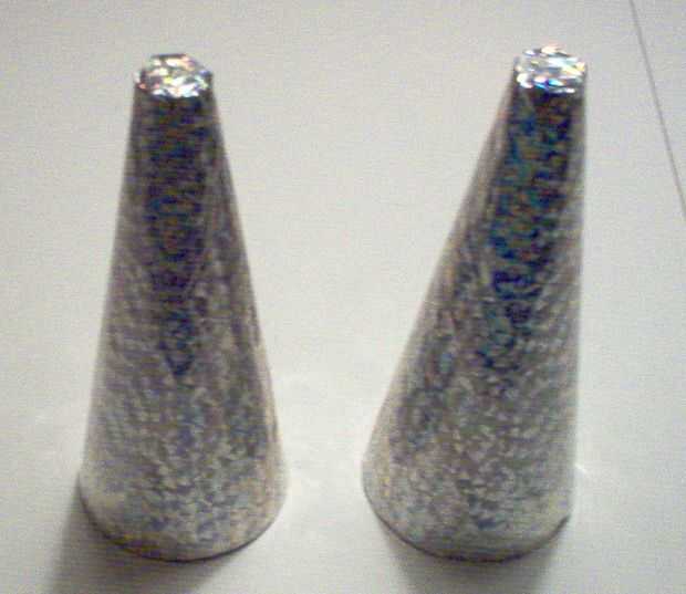 Una vez seco el pegamento, puede recortar la parte inferior del papel si hay exceso, y entonces es tiempo de terminar la parte superior. La parte superior de los conos de espuma de poliestireno es contundente (truncado), probablemente porque un punto fuerte sería muy propenso a la rotura. Así que para cubrir la superficie, sólo cortar el papel sobrante en la parte superior en 4 pestañas. A continuación una ficha sobre otra, superpuestas como una tapa de la caja con adhesivo.