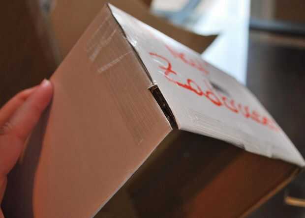 Encontrar una caja pequeña como a en forma de cubo que pueda, igual a la mitad de la longitud de su nivel inferior. Con unas tijeras, corte una ranura delgada aproximadamente una pulgada en cada esquina, sólo lo suficientemente amplio como para el cartón caber en él. Usé mi primer chatarra de recorte como guía para marcar las otras esquinas y hacen todos la misma profundidad. Supongo que un gobernante también habría hecho el truco, pero bueno. Soy un improvisador. Cortan la parte superior de la caja (si tiene uno) para que el árbol puede sentarse en él. Coloque sus niveles de cuatro árboles en las muescas de cuatro esquinas de su stand. No te preocupes, vamos a gussie es hasta más tarde. ;)