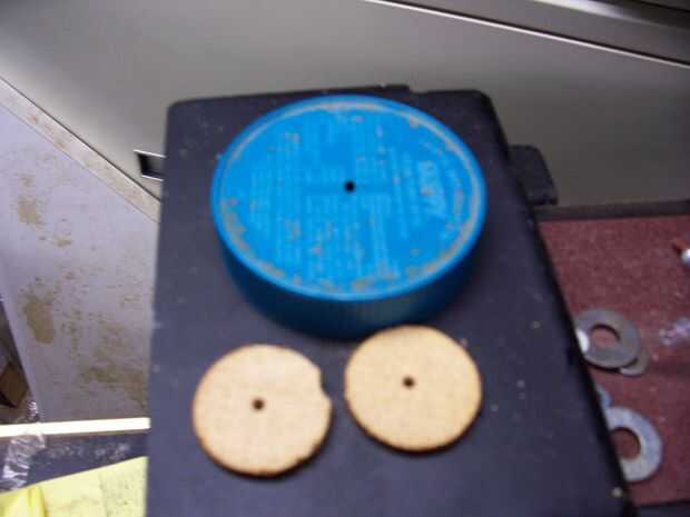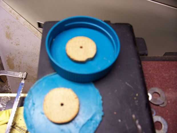 Calentar el pegamento caliente y pegamento uno de los trozos de madera a la pieza superior de mantequilla de maní para que alinee el agujero en el centro exacto de la tapa (hay un pezón pequeño por lo que es fácil de hacer). Luego pegar la otra pieza en la tapa del tarro de mantequilla de maní todavía intacto. Luego tomar la misma broca que utiliza para la madera y el taladro en la tapa del cacahuate intacto a través del orificio hecho en la madera.