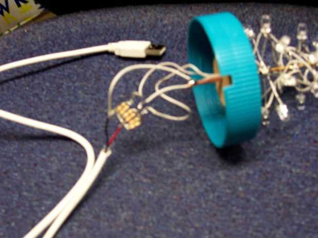 Ahora, suelde el cable del LED verde/azul a una de las resistencias de ohm 178 (uno 390 y uno 330), el alambre del resistor del ohmio de los LEDs rojos a 195 (dos 390) y el cable del LED blanco a la resistencia ohm 178 (uno 390 y uno de 330). Cubre todas las conexiones abiertas (excepto el extremo abierto del cable negro) con cinta aislante, que no desee un corto y pegamento caliente el cable USB en su lugar dando alrededor de una pulgada dentro de la tapa.