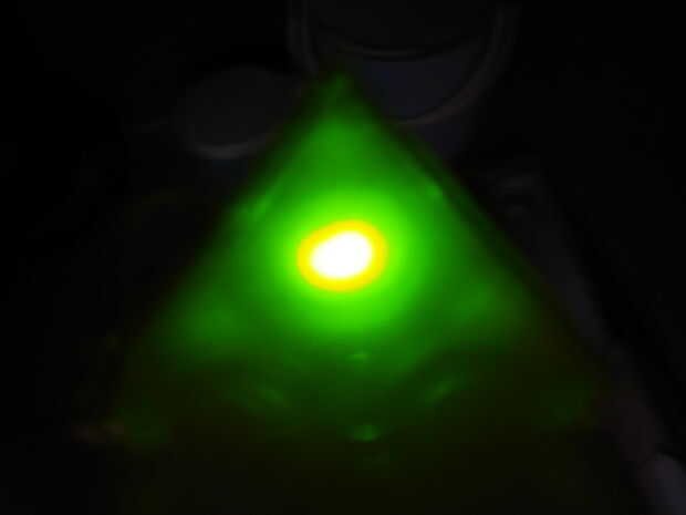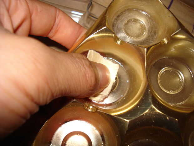 Muy bien! Ahora que el interior de la tapa es agradable y escarchado, baje la bandeja de oro upiside y Lije ligeramente el interior de las 'células' con un nuevo pedazo de papel de lija. Ahora el lado de la bandeja que se enfrentaba a la parte inferior de la carcasa cuando fue empaquetado antes de que se hará referencia a como la parte superior. Ahora para probar cómo difusa es la luz, conecte uno de su LED a una batería. Luego coloque el caso de que usted sólo arena en la parte superior de la bandeja. Coloque el LED que brilla intensamente en una de las celdas, asegurándose de que hay sobre 5mm - 1cm de separación. Debe venir hacia fuera agradable y difusa (la cámara hace que se vea que hay una mancha de color amarillo, que normalmente no hay).