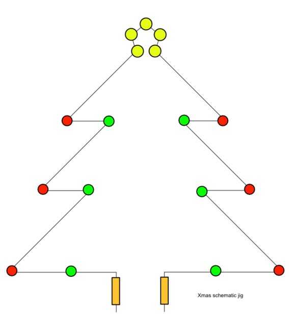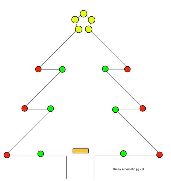 Si nos fijamos en el diseño B, vemos que hay dos caminos entre los dos terminales. Los cables en la parte inferior de los LEDs verdes más baja sólo conectan a un terminal y puente en la manera alrededor del contorno del árbol. Los otros terminales de los LEDs verdes más baja están conectados a través del resistor, haciendo dos circuitos paralelos.