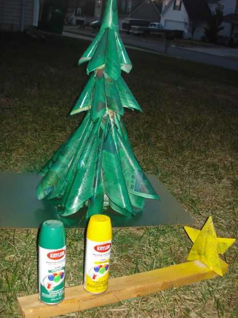 Para pintar poner el árbol en un pedazo de cartón para llevar a cabo y poner un clavo en un trozo de madera para sostenerlo para arriba. He seguido las instrucciones de pintura en aerosol Krylon para pintar el árbol y la estrella. Solo hice una capa para dejar el papel de la prensa muestran a través de, pero podría hacer múltiples capas para obtener un árbol verde brillante y estrellas. La pintura se seca en 10 minutos directamente después de rociar, espolvoreado el brillo en el árbol y la estrella así se pegaría a la pintura.