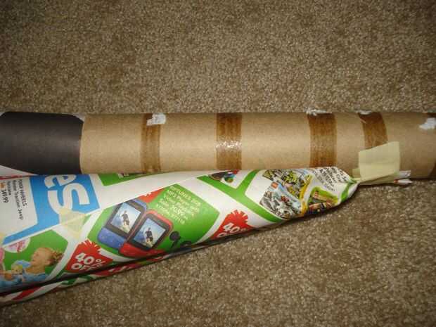 Tomar uno de los embudos y ponerla dentro del tubo de toalla de papel firmemente; cinta para fijar si es necesario. Luego comenzar a colocar embudos por la parte exterior del tubo de toalla de papel con cinta, alineando la parte inferior del embudo con la pieza insertada en el tubo. Colocar ocho alrededor del tubo.
