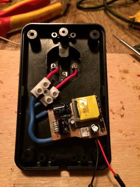 Utilizando la Dremel, o su herramienta preferida de destrucción precisa, retire la cubierta del cargador. Identificar donde se conecte la red y donde conectan el GND y 5V del cable USB. La soldadura de cables gruesos para la conexión a la red. Corte un cable de la placa por la mitad y la soldadura de los extremos abiertos a GND y 5V (para corrección de color corte dos negros para GND y un rojo para 5V). Coloque el cargador dentro de la caja y el otro extremo de los cables gruesos para la conexión a la red de la soldadura. Para soldar en el conector de red puede ser un poco complicado. Si lo tienes, utiliza un grande, extra caliente Cautín, más grande que se utilizaría para la electrónica fina. Para la soldadura fácil, pongo un conector entre la corriente y el cargador.