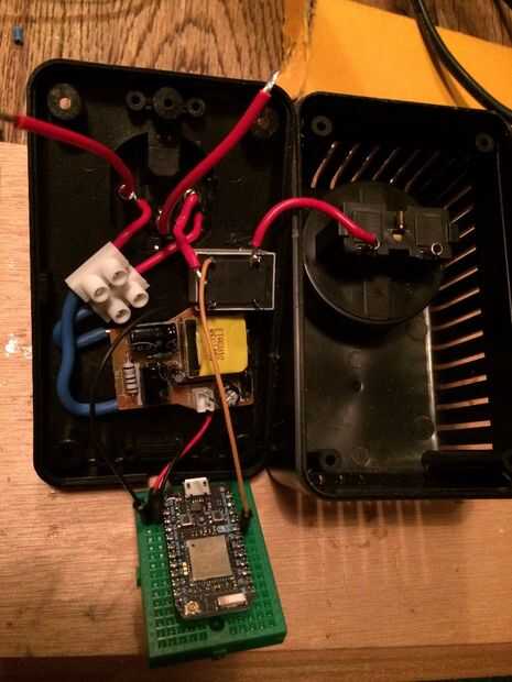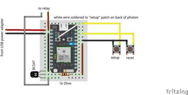 Antes de pulsar el fotón en el protoboard: media un alambre de protoboard para el parche de "configuración" en la parte posterior de los fotones de la soldadura. Presione el fotón en el protoboard y conectar todo como se muestra en el esquema. Para los pulsadores y los cables que van a la bobina del relé: corte el extremo de los cables de la placa y soldar los extremos abiertos de los botones y el relé respectivamente. Pegamento caliente los pulsadores para el exterior del recinto. Que tenga que hacer un agujero adicional para pasar los alambres a través.