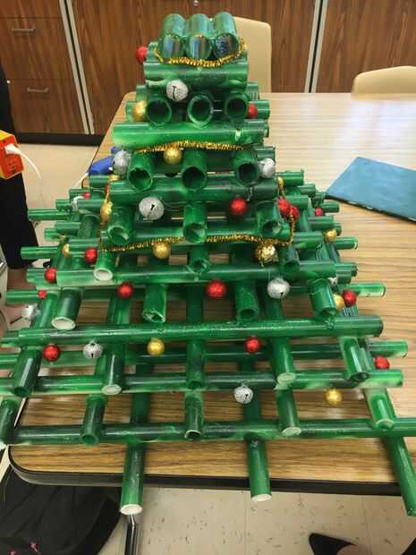 Decorar el árbol con adornos de su elección, entonces usando una lata de aire comprimido, sople aire en las aberturas del tubo para crear sonido.