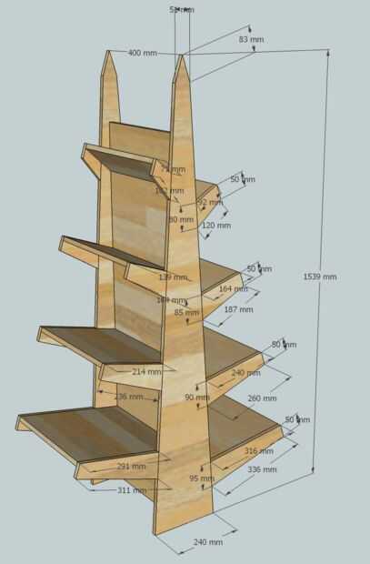 Sketchup. Los estantes son aparte, con el desplazamiento de dos lados por 100 mm 300 mm. La otra pieza de madera que tenía era 400 mm de ancho, por lo es la profundidad del árbol. El archivo de Sketchup a continuación estaba cerca de la versión final que terminó cortando (Nota: se ha subido en un archivo .zip, porque el uploader de archivos no parece permitir .skp extensiones más). La principal diferencia es que los estantes terminaron por sentarse sobre las ramas, en lugar de ser equipadas en su interior.