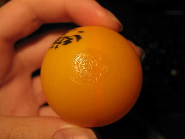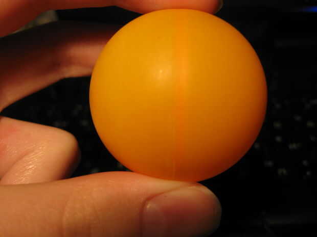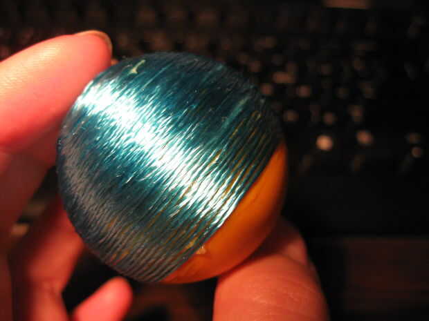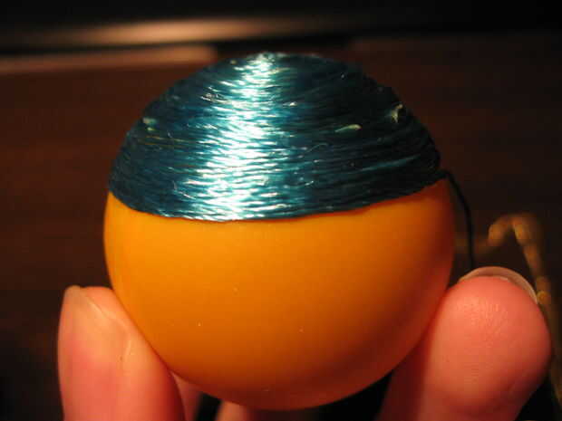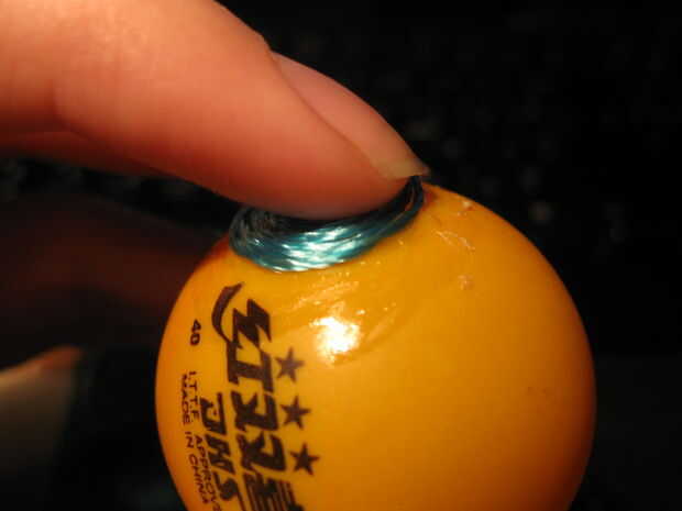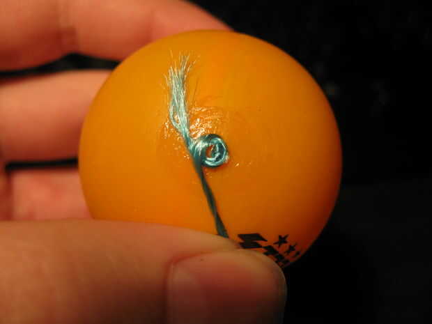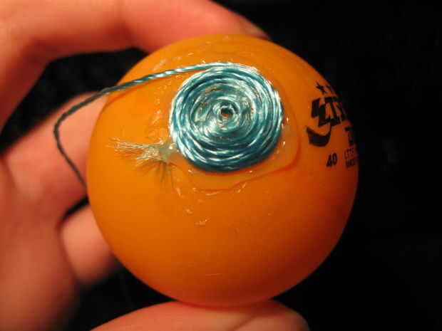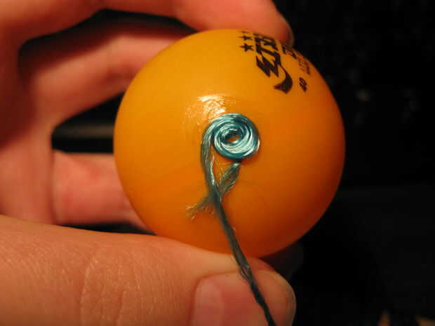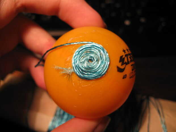 Como ustedes saben la pelotita de ping pong está hecha de dos partes que se conectan para hacer una bola. Tratar de encontrar donde están conectadas las partes. Poner allí algunos pegamento y pegar el hilo. Ahora gire en sentido antihorario o en sentido horario no importa. Continuar agregar el pegamento y pegar el hilo. Lo pegan cuando presione un poco por lo que puede pegar bien.