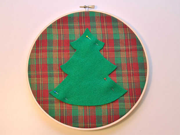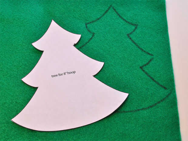 Cortar una forma de árbol de fieltro y centro en la tela, pin en su lugar. Diseñar su propio árbol o imprimir el patrón PDF que os adjunto.