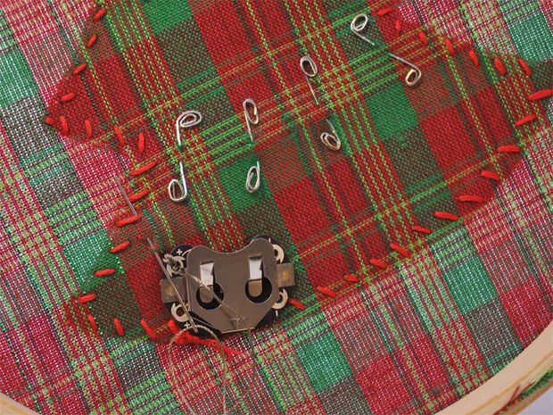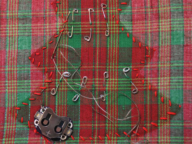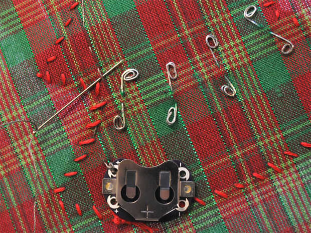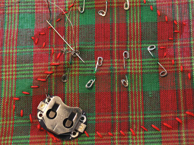 Con un nuevo trozo de hilo conductor, lazo alrededor de una sección de su 'poder' línea/puntada cerca los lazos superior que funcionan en sus filas de LEDs. Coser cuidadosamente cada bucle LED para conectar entre sí a través de la fila. No deje que el hilo toque los lazos de la parte inferior. Al llegar al último bucle en la fila, el hilo del nudo y la cola del viaje.