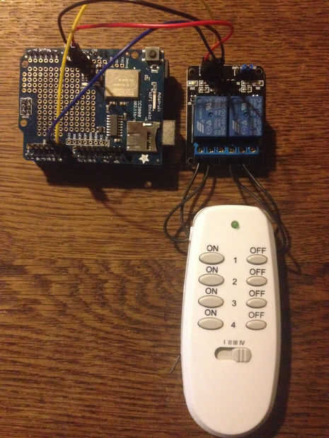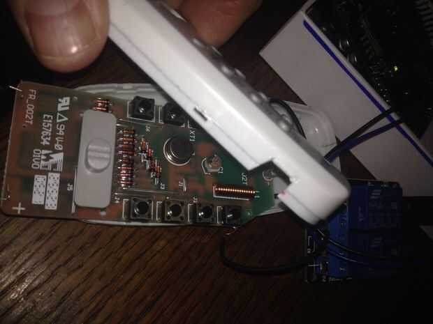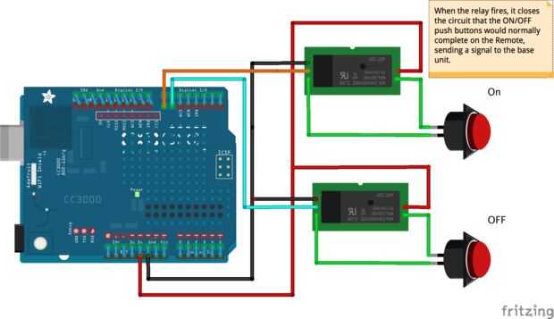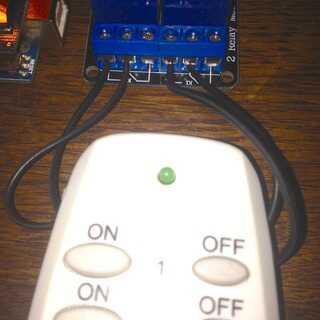 Alambre de los cables sueltos de su mando a distancia para el común y normalmente abierto (NO) conectores de los relés. Esto significa que en el estado de reposo, el circuito entre cada alambre es incompleto: no ves esa luz LED pasando cuando se conecta al relé. Si lo hace, probablemente esté conectado a los conectores normalmente cerrado (NC) y común. Mal camino, volver! En mi ejemplo, el botón de apagado está cableado en relé 1, el botón de encendido en el relé 2.