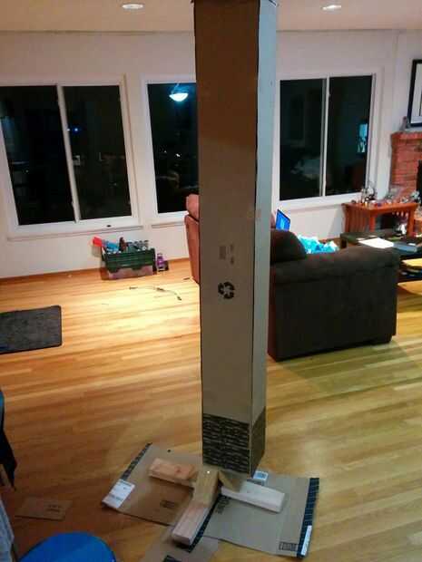 Cajas de uso 8 x 8 x 12, o cualquier otras piezas largas planas de cartón, para formar el tronco del árbol. Sujetar la cartulina de tronco a tronco 2 x 4 en los dos lados como se muestra en la imagen de arriba. Esto resulta en un desplazamiento tronco desde la base, pero ofrece un extremadamente robusto