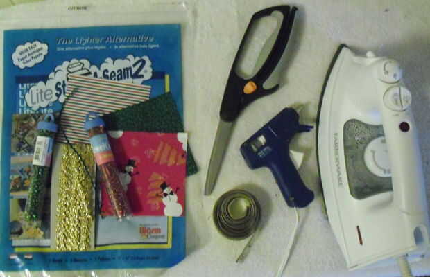 Materiales: Cuadrados de tela (son aproximadamente 3") Entretela fusible Abalorios y botones cinta tijeras pistola de pegamento caliente cinta de medición hierro