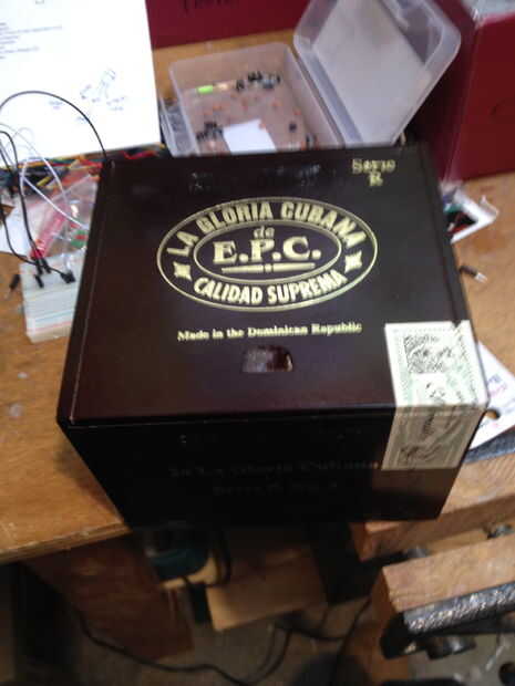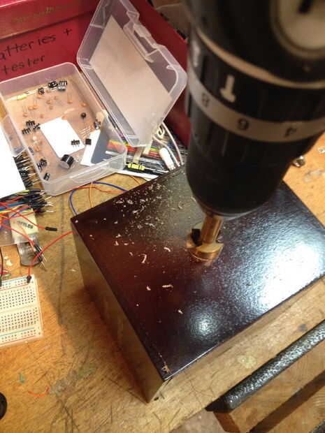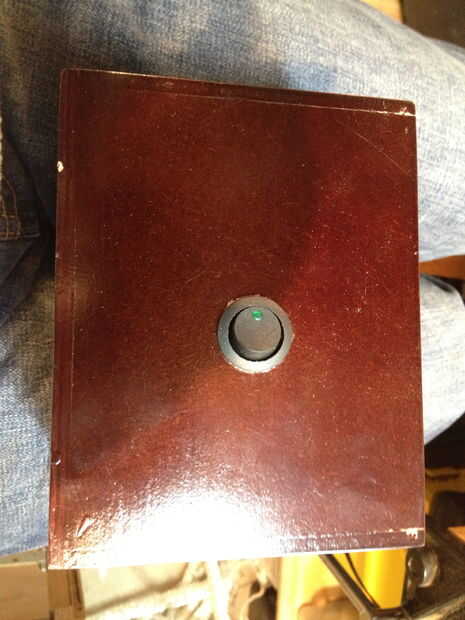 Utiliza las baterías de NiMH para que yo los puedo recargar a través de la fiesta. El caso que usé era una vieja caja de cigarro. Hice una ranura en la parte posterior de la tapa deslizante para permitir que los cables para el adorno venir a través. Taladré un agujero de 7/8 de pulgada para el encendido/apagado interruptor de eje de balancín y un agujero de 1/4 de pulgada para permitir que los cables del sensor hasta la salida.