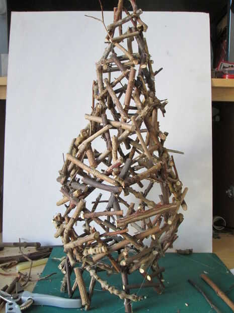 Puesto superior parte inferior juntos. Pude colocarlos encima de la otra sin pegamento y sin caer. En todos los lados añadir pegamento y trozos de rama para conectar las dos piezas. Quite los hilos restantes el pegamento de fusión.