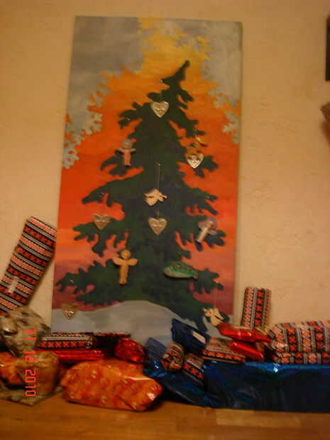 pongo clavos pequeños en el tablero para colgar los adornos. Sin embargo, fue algo difícil de encontrar que se ajuste con los colores, por lo tanto, probablemente, un árbol más estándar sería más fácil. Añadir regalos y disfruta!!!