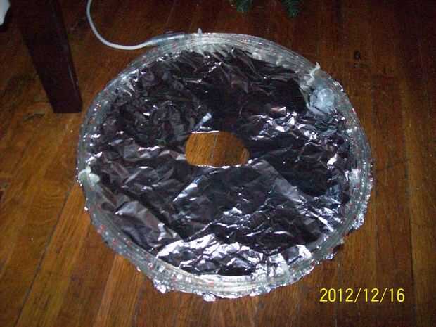 Aunque Ryan Kelly menciona que él utilizó cartulina negra para el respaldo de sus portales, mi compañero de proyecto Oksana sugirió usar papel de aluminio en su lugar. Cuando se enciende para arriba, el estaño ayuda a reflejar la luz coloreada del portal, así como el verde del árbol, que ayuda a que se parecen más a un portal abierto, que brilla intensamente.