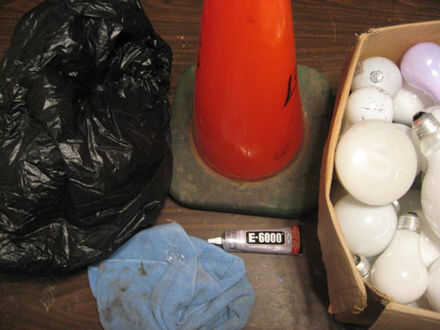 Cono de tráfico Bolsa de plástico para montar en cono. (pegado al cono de paradas) Bombillas de luz. Pegamento E6000. De trapo, (para mantener los bulbos en su lugar y hacer agujero en medio de luces led)