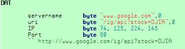 Esta es la página web que contiene nuestra cotización acciones. Cambiar la línea:uri byte "/ig/api?stock=DJIA",0