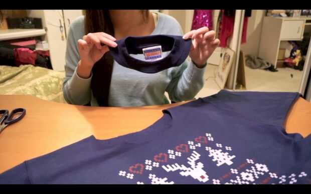Vamos a ampliar el escote para un look de Kelly Kapowski! ¿Que solía ver salvados por la campana? Usando el collar existente como guía, corte 1/2 pulgada más en cada lado pero sólo en la parte inferior del collar existente. Corte la parte delantera y la espalda por separado para que la espalda no es tan baja. Usted necesita tener cuidado de que no cortes el cuello demasiado grande porque no hay vuelta atrás!