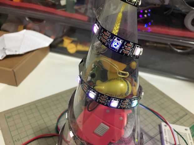 Este escaparate interior de árbol de Navidad animado utiliza una combinación de cinco WS2812 direccionable pixel LED pega la estrella. 16 LEDs de píxel individual ensartados por las luces del árbol de Navidad y una tira de LED verde cortado en tiras