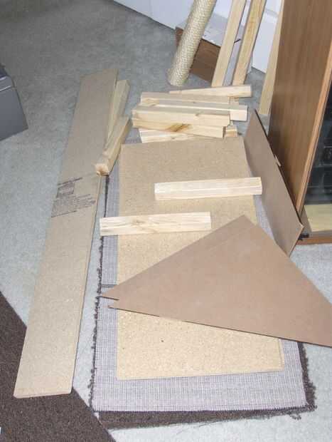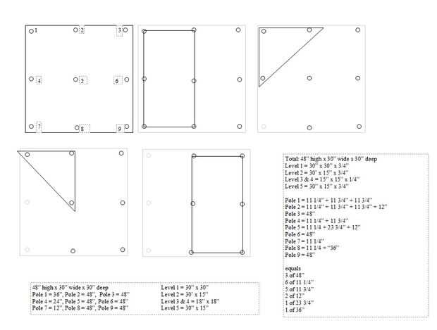 Nuestro diseño consiste en vistas de arriba hacia abajo de cada nivel, mostrando donde se necesitan postes para soportar los niveles, y cuántas de que tamaño necesitamos. Cortamos los tableros según nuestro diseño con la sierra circular, para que tuviéramos un tablero de madera aglomerada de 30 "x 30" (o un poco más grande) y otro 30 "x 30" cortamos por la mitad, para los dos 15 "x 30" rectangular, niveles de partículas (el primer nivel y el nivel superior) y luego un 18 "x 18" cuadrado de MDF que cortamos por la mitad en dos triángulos de la derecha para los niveles 2 y 3.