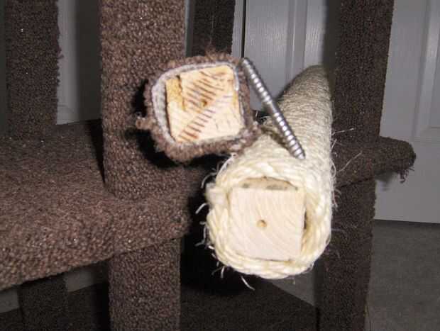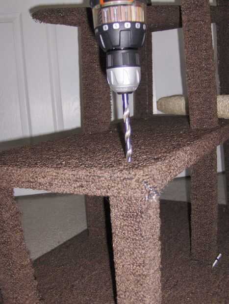 Empezamos por taladrar un agujero piloto en el centro de la parte superior e inferior de cada poste para que cuando ponemos en el tornillo de madera o la espiga, estaríamos seguros de que no terminamos entrando en un ángulo. Entonces comenzó a construir el árbol del gato colocando 6 11 1/4" postes en posiciones 1, 2, 4, 5, 7 y 8 a la mesa rectangular para nivel 1. Para hacer esto, lo primero alineados donde queríamos colocar los postes y los orificios perforados en la placa de nivel 1. Para el poste en posición, hemos perforado un orificio piloto de uno de los tornillos de madera, pero para los otros postes, perforó un agujero a través de la placa para el tornillo pasador a través de y mediante pinzas o el taladro, tornillo de la varilla de pasador en el extremo superior de los postes para las posiciones 1, 2, 4, 5 y 8. Para el poste en la posición 7, atorníllelo en el tablero de nivel uno con un tornillo para madera. Luego se alinean los polos con nivel 1 en la parte superior a la base y atornille los postes en la base con tornillos para madera.