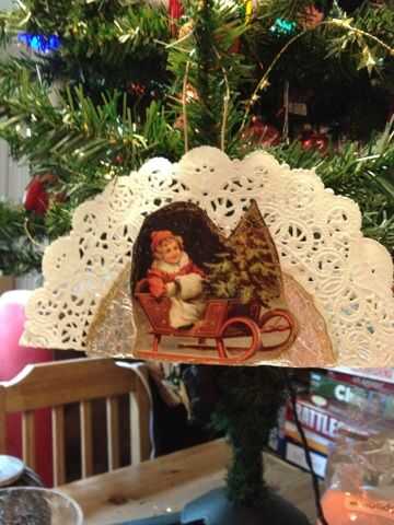 10. postal victoriana adornos vienen próximos.  ¿Por qué postales victorianas?  Ya postales son las imágenes victorianas más baratas que pude encontrar fácilmente.  Puede utilizar toda la tarjeta del poste, o pegar la imagen central para cortar papel en una carpetita que paso y recorte con pintura de oro y brillo, como lo hice.  También puede comprar fantasía victoriana Dresden papel adornos para colgar en el árbol.  Los adornos deben tener algo de chispa para funcionar y mira a la "derecha".