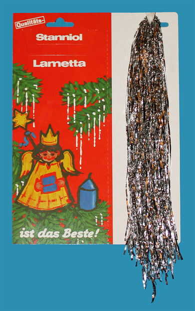 Malla de plata verdadera completaría un árbol de Navidad victoriana opulencia. Me encanta el oropel, pero no es una buena idea utilizar alrededor de niños pequeños o mascotas, por lo que no utilizamos. Malla plástico atrae la electricidad estática, por lo que no se cuelgue correctamente. Oropel real es según los informes disponible de The Vermont Country Store y Blu & Company. Nunca he probado cualquiera de estas mallas, por lo que no puedo dar fe de su autenticidad. La imagen de abajo es un relativamente nuevo paquete "antiguo" de malla de papel de plata hecho con estaño y plomo. Vidrio más grande, o adornos de plástico carámbanos pueden utilizarse en lugar de malla de papel de plata. Tu árbol de Navidad de la pluma de estilo victoriano debe buscar exuberante y completo ahora!