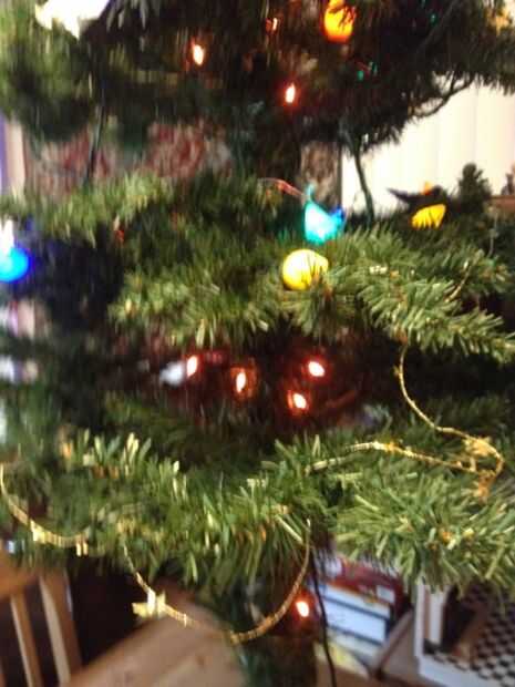 7. ahora es el momento para poner algunos brillo contra el tronco o poste del árbol, comenzando por abajo y va hasta la parte superior.  Me gusta usar luces twinkle color ámbar que lentamente se desvanecen en y hacia fuera.  Se parecen a las hadas que vuelan alrededor del árbol.  Puede utilizar cualquier color twinkle luces o múltiples luces de colores.  Las luces ámbar twinkle agregar un antiguo calor al árbol.
