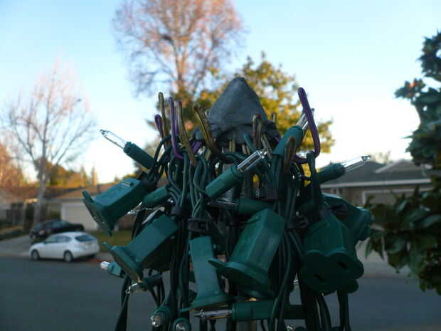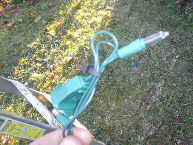 Tome una atadura de cables y el conector hembra de nuevo en el cable de la curva y apriete el lazo del cable, debe tener un pequeño lazo en el extremo de la cadena de luz que se enganchará a las perchas.