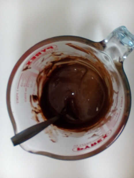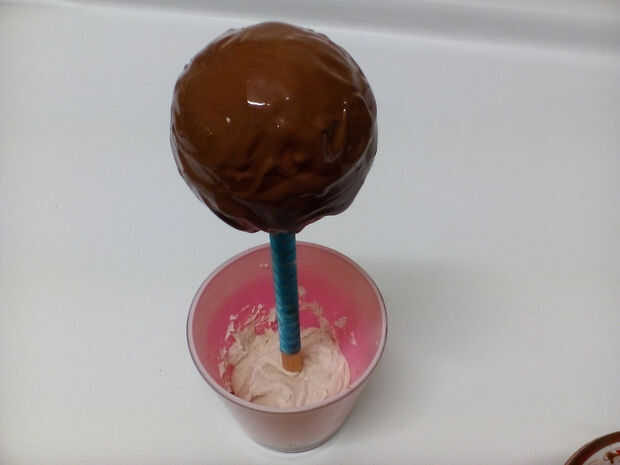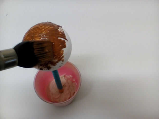 A continuación, pinte la bola de poliestireno con una capa fina de chocolate. Esta capa no está diseñada para comer sino para ocultar el poliestireno y darle las melcochas que se adhieren a.