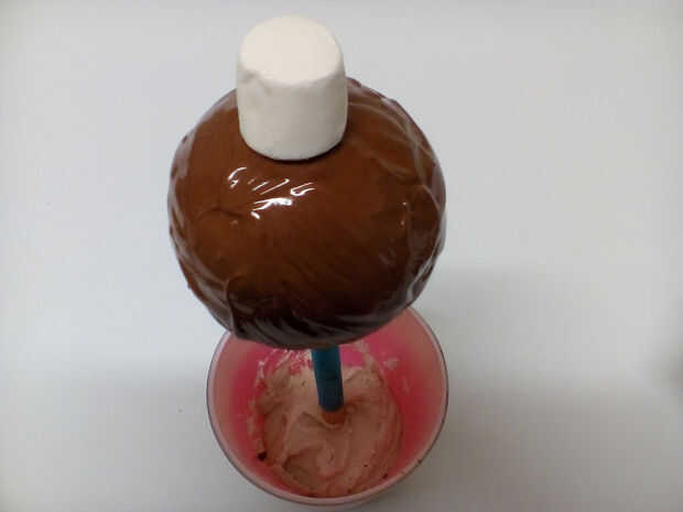 Las primera algunos malvaviscos deben fijar en sin cualquier chocolate adicional. Simplemente pulse y mantenga suavemente en su lugar por un momento hasta que se pega sin deslizamiento. Comience agregando una derecha en la parte superior de la bola. Luego pasar a la siguiente, agregar malvaviscos en círculos de la parte superior de la bola.
