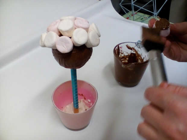 Una vez que el chocolate de la pelota ha comenzado a endurecer, necesita agregar un poco de chocolate derretido en la parte inferior de la melcocha con la brocha de cocina para ayudar a mantener en su lugar (la piscina de chocolate debe permanecer fundida mucho más tiempo, pero si es necesario que usted puede calentar brevemente para fundirlo otra vez).