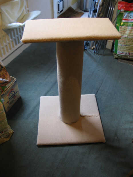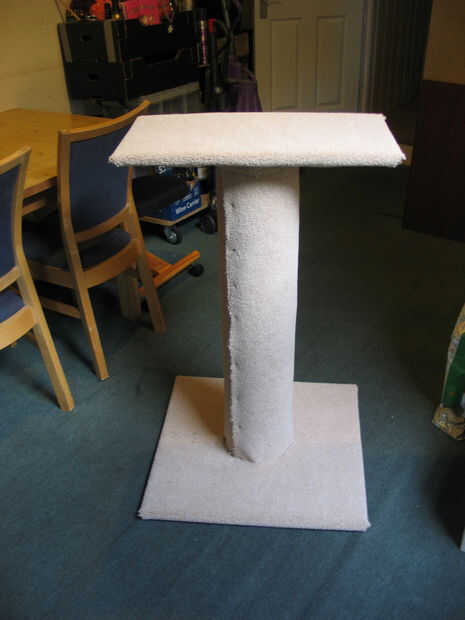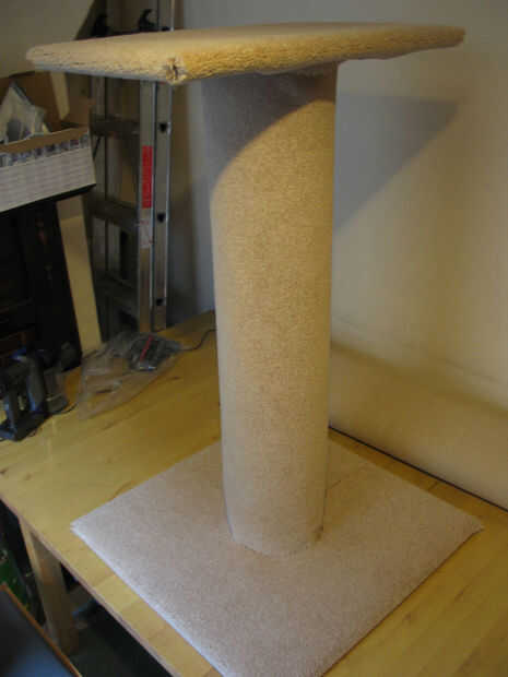 Diseñé esta agradable y estable, por lo tanto, la gran base, pero también lo suficientemente grande como para que un gato para estirarse sobre ella si quería. El panel superior no se extiende más allá de la base para que el centro de gravedad está siempre sobre la base, incluso si el gato hace un salto para una mesa de pedestal.