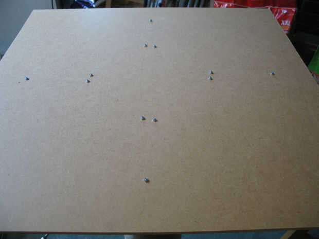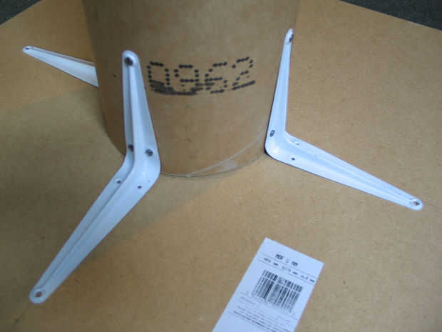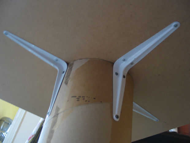 Con los tornillos, adjunto los soportes de estanterías para el tubo de cartón. Con un perno y tuerca por agujero, adjunto los soportes en la base con las cabezas de los pernos pasando por la superficie superior del tablero (es decir, las tuercas sería debajo de la).