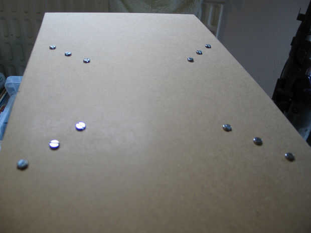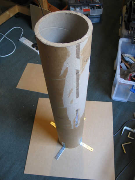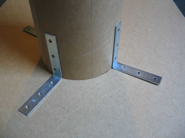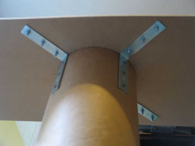 Con los tornillos, adjunto los soportes de ángulo recto para el tubo de cartón. Usando un perno y tuerca por agujero, adjunto los soportes para el tablero superior con las cabezas de los pernos otra vez atravesando la superficie superior del tablero.