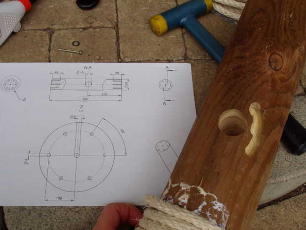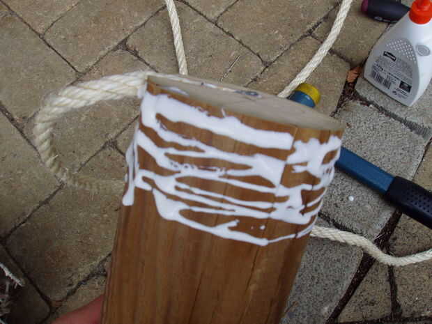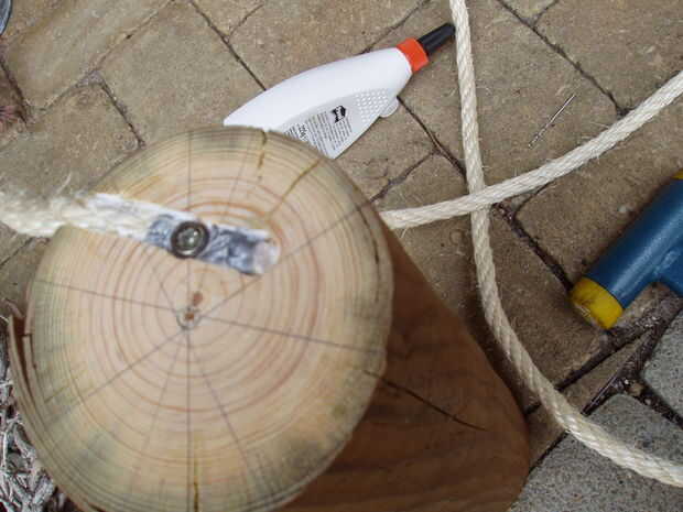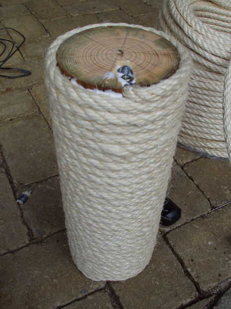 Algunos ductape alrededor del principio del sisal cuerda para que no debilite wraped. Puse algunos glew en el surco y utiliza un tornillo para madera y un wascher para fijar la cuerda al poste. Entonces me quedé para envolver la cuerda alrededor del poste con algun pegamento más madera. Al final me fijo la cuerda en el la ranura.