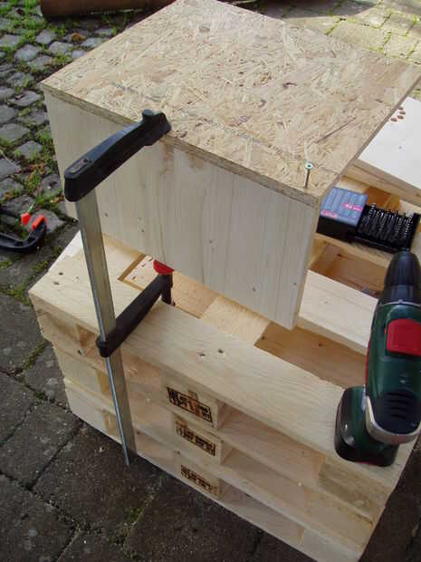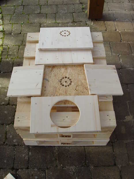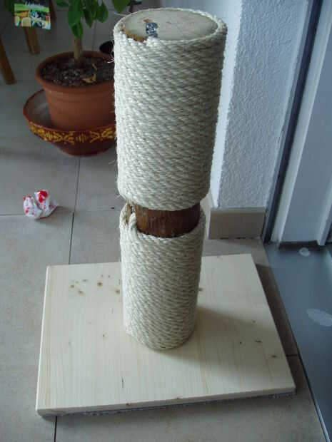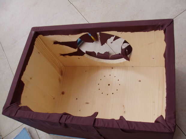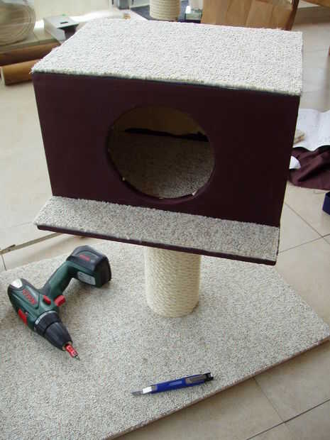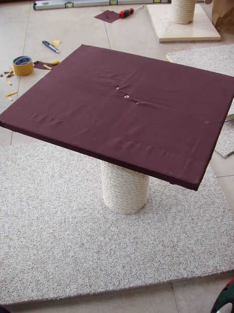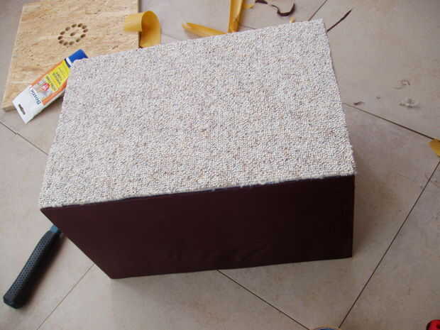 Luego armar el resto de la casa por separado de la parte inferior con tornillos y luego envuelto en paño y corte la abertura en la parte delantera. También perforar previamente los orificios aquí. Antes de atornillan el polo de la pequeña plataforma encima de la casa pegué un trozo de alfombra en él.