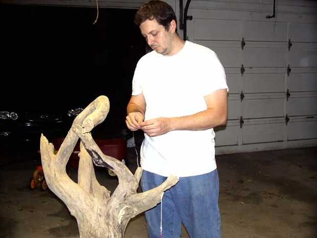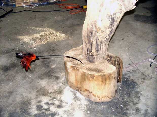 ... así que dejar de preocuparse por cómo vas a decorar esta cosa y a lograr que se haga. Si tus gatos como este va a ser por los juguetes, no debido a cómo está colgados. Lo primero que hice fue preparar el juguete principal. Mencioné anteriormente que tengo dos gatos exigentes y realmente sólo jugar con los 3 juguetes: un plumero mirando lo que parece los de entrada, una caña de pescar de juguete se puede convertir (Instructable muy pronto!) y el omnipresente puntero láser que actúa como algún tipo de crack óptico a la población felina. Si eres como yo y no tiene una óptima selección de longitudes de cadena sería recomendable perforar a través del centro de sus sucursales por lo que puede fijar la cuerda mientras que usa menos longitud (lo que le permite controlar mejor el efecto de pendientes tan importante).