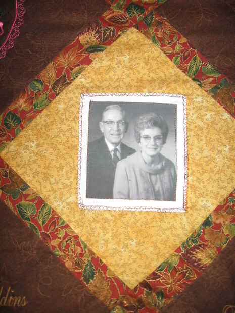 Siguiendo las instrucciones en el patrón de color de rosa de Arbor utilizado por la computadora y descargar la foto que quería poner en el tejido. Así que me Coloque la foto frabic en mi impresora y ejecutarlo mediante el siga las instrucciones en la parte posterior de la misma para bajar las fotos. Así que tienes que dejarlo establecido para la tinta. Luego corté las imágenes al tamaño quería y luego cosido en el centro de las plazas. Había apoyado el acolchado superior en el piso primero y poner pequeños trozos de papel con los nombres de donde quería ir y cosido lejos. Utiliza un stich reliquia en mi computadora.